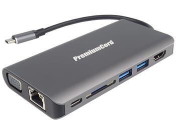 - PremiumCord Převodník USB-C na HDMI+VGA+RJ45+2xUSB3.0+SD card +3,5mm+PD charge